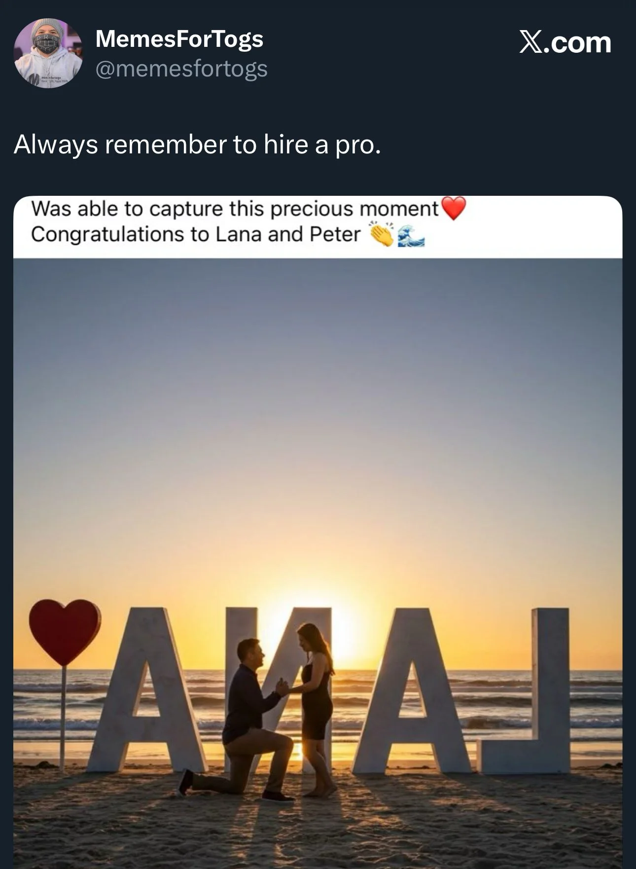 The image, posted by the photography account @alexlexobx1 depicts a man proposing to a woman at sunset in front of large white block letters spelling “ANAL” — the visible portion of a coastal landmark whose remaining letters extend beyond the frame. “Alex” writes, “Was able to capture this precious moment. Congratulations to Lana and Peter.” Whether facetious or not, good going Alex! Way to capture the moment!